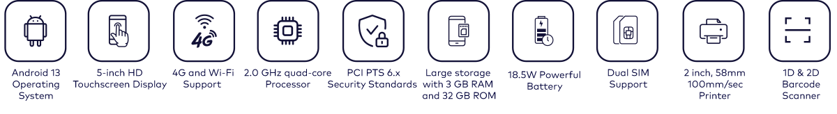 Certificates And Compliance PCI PTS 6.x, EMV L1&L2, EMV CTLS L1, Paywave, ExpressPay, D-PAS, TQM, RoHS, CE
