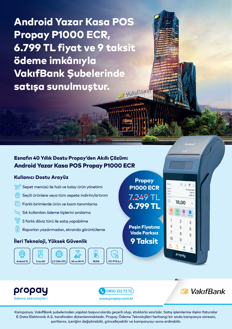 İşletmelerin hızlı, güvenli ve kesintisiz ödeme almasını sağlayan Android Yazar Kasa POS Propay P1000 ECR, sadece 6.799 TL fiyat ve vade farksız 9 taksit seçeneğiyle VakıfBank Şubelerinde!