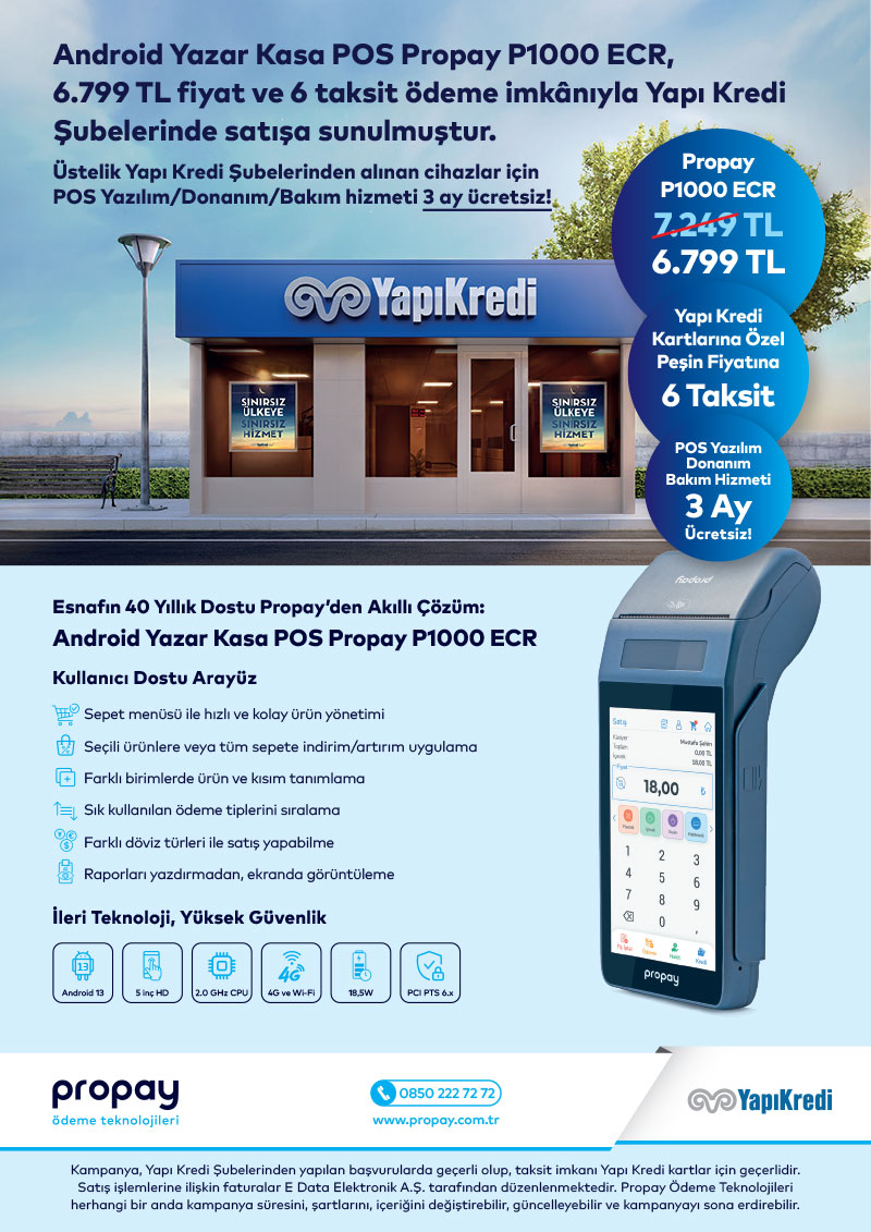 İşletmelerin hızlı, güvenli ve kesintisiz ödeme almasını sağlayan Android Yazar Kasa POS Propay P1000 ECR, sadece 6.799 TL fiyat ve vade farksız 6 taksit seçeneğiyle Yapı Kredi Şubelerinde!