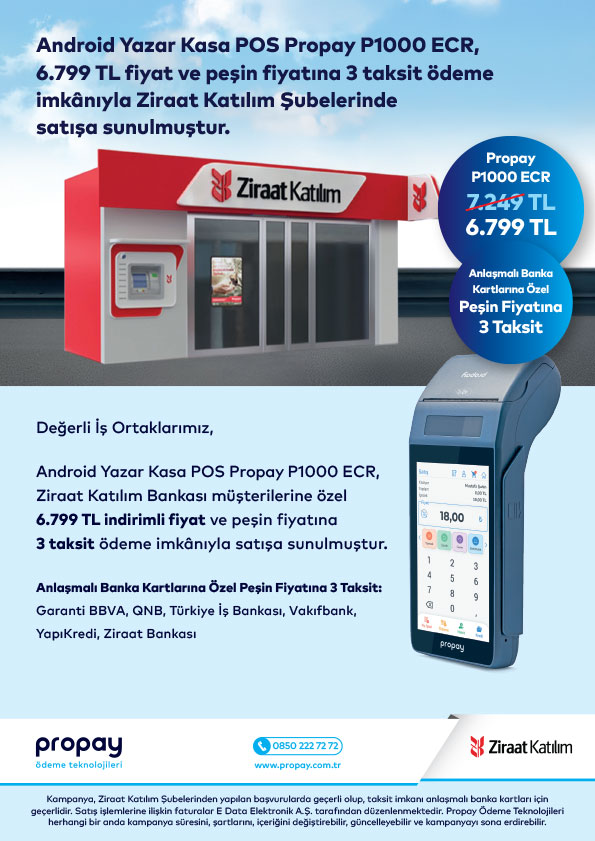 Propay P1000 ECR 7.249 TL yerine Ziraat Katılım Üye İş Yerlerine özel sadece 6.799 TL,