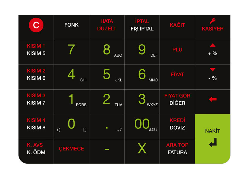 X – Z – EKÜ – SET konumlarına giriş şifreleri ortaktır. Bu şifre fabrika çıkışında “0000” olarak programlanmıştır. Bu şifre yazar kasanın programlama (SET) konumundan değiştirilebilir.