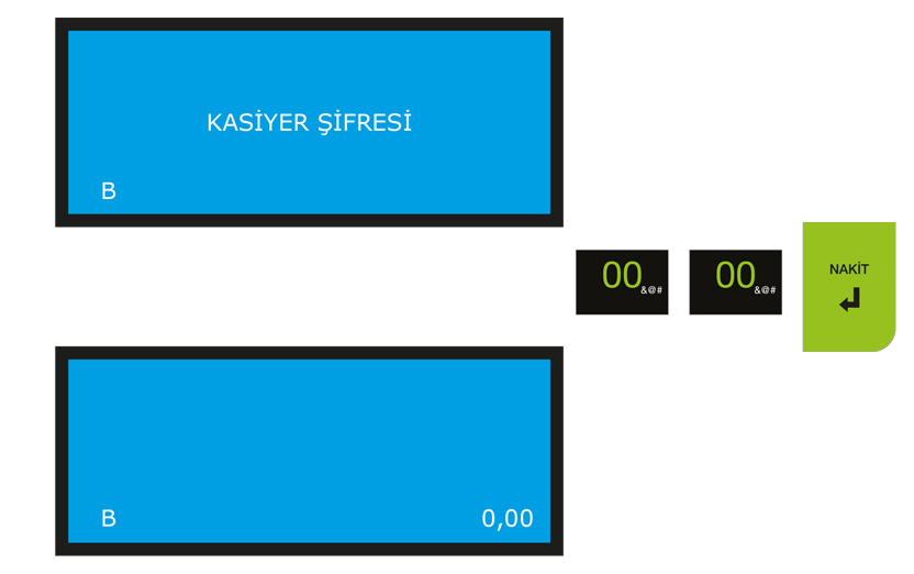 Kasiyer şifresi A, B, C, D kasiyerleri için fabrika çıkışında “0000” olarak atanmıştır. Aşağıdaki şekilde şifre girişi yapılarak kasiyer seçimi tamamlanmış olur.
